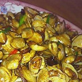 食材明细:海瓜子500g、红辣椒(干)适量、姜丝适量、葱段适量、豆豉油适量、老抽适量、蚝油适量、糖适量、料酒适量制作步骤:1. 烧一锅水,快开的适合,倒入海瓜子,煮五分钟捞出,放一边去水。2. 姜切丝,辣椒干和葱切段,备用。3. 起油锅,先倒入辣椒干和姜丝爆香。4...