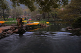 柳岸笼晴雾,花桥映碧浔——西溪烟水渔庄晴光漫过西溪的岸,烟水渔庄的春,是从雾霭里慢慢漾开的。木桥枕着碧流,粉紫的鲁冰花与幽蓝的飞燕草,在风里舒展着花序,像把揉碎的云霞,撒在了溪岸。水雾从水面浮起,笼着远处的柳色,也笼着桥上往来的人影,连廊边的红灯笼,都浸在朦胧的绿意里,平添了几分江南的韵味。溪上的乌篷船摇着橹声,划开一圈圈涟漪,载着满船的碎光,往花影深处去了。岸边上的游人,就着树荫与花香闲谈,风穿