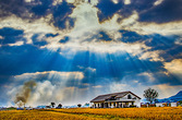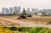 亚运村高梁收割完,农用平地机在平地,尘土飞扬。