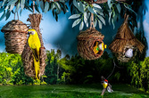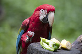 鹦鹉食玉米和香蕉,松鼠来偷食。