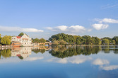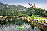 杭州之我色196-国庆节湘湖帆船训练基地3 有人只知道西湖,不晓得还有湘湖,她们可谓姊妹湖,够媲美的,分居也不太远,西湖“城”一点,喜欢“郊”一点,真是一点,之间不敢开民航。 这是湘湖一角,叫什么帆船训练基地,游人可以去自驾划艇,别不好意思,是要给费的,掏腰包的还不少,不少外国人,不会用钱的就刷卡。
