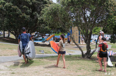 奥克兰陶哈拉努伊地区公园。陶哈拉努伊地区公园(Tawharanui Regional Park)曾经是一个大型的私人农场,覆盖了半岛的末端,这座半岛一直延伸至卡瓦岛(Kawau Island)北部的太平洋。位于其北部的狭长沙滩被视为奥克兰地区最好的游泳和冲浪场地之一。沙滩的岸边有一片绿色的草地,上面高耸着几株枝叶茂盛的普胡图卡瓦树,堪称休闲野餐的天堂。 一条生态步行道始于海滩的一端,越过一片新西兰