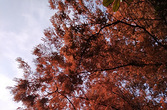 把色彩大胆地绽放在天地间的画布上,由你我撑起,雨丝淅沥间,传递着彼此指间的温度,脑中跃然的就是那一句:人间最美是清欢 喜欢水杉,今年胜过了银杏!也许是它冷冽的高贵完胜了银杏的华丽与喧嚣 小径的两侧是整排高耸挺立的水杉,枝叶浓密却透着清爽,有序又不生硬!满地的水杉落叶,红若胭脂,也许随便拈上一指便可令美人桃色绯然!间隙中排列着不同的色度,如溅落的调色盘:这里多一点深,那里洇开一些淡,脚下又