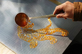 糖画,师傅用勺子三两下就构勒出维妙维肖的图案,令人称道。