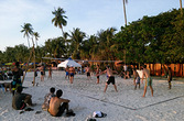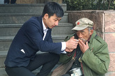 在梅家坞路过某餐厅,一乞丐坐在台阶上,见餐厅走出一服务生给了他钱还递了一根烟给他,还蹲下为他点烟。见到此情不禁拍下此照,并为小青年点个赞。