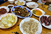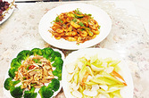 小炒鸡,白切肉,肉末豆腐皮,娃娃菜,豆芽菜 花生米,小番薯