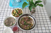 今天没出门,在家晒被子, 洗被单,打扫卫生,然后做了三个菜 卤牛肉 排骨莲藕汤 芹菜香干 犒劳下自己 再配上一杯自酿葡萄酒 ,一个人也不能亏待自己
