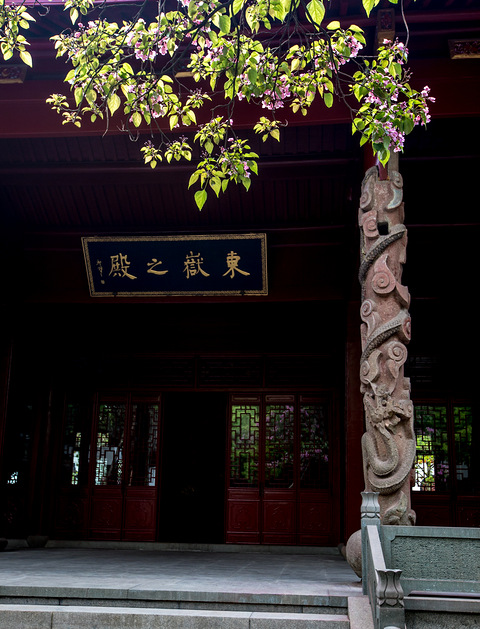 今日下午,春雨绵绵的天空出现了淡淡的阳光,春光明媚,一直记挂吴山东狱庙里的二棵533年的楸树开花了没,可一踏进庙内,花已开始谢了,浓郁的胭脂味香气也闻不到了,抬头仰望,还好,其中一棵还有许多花挂着,只见粉紫色的小花挂满树冠,花朵茂盛,层层叠叠,在近10几米的高空中尽情绽放,像开在树上的彩霞。苏轼有诗云:“楸树高花欲插天”。白色的花瓣上点缀着粉紫色的纹络和斑点,煞是好看。