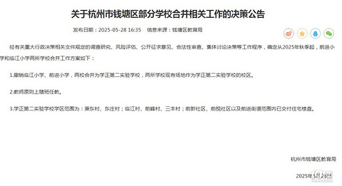 今年9月份开学,杭州市钱塘区前进小学与临江小学正式合并,组建成“杭州市钱塘区学正第二实验学校”开启“迎新”。 近日,杭州市钱塘区学正第二实验学校发布公告,具体内容如下: 为进一步优化区域教育资源布局,提升基础教育质量,促进教育公平与均衡发展,经杭州市钱塘区教育局研究决定,杭州市钱塘区前进小学与杭州市钱塘区临江小学正式合并,组建成“杭州市钱塘区学正第二实验学校”。原临江小学校区自合并之日起不再启用,