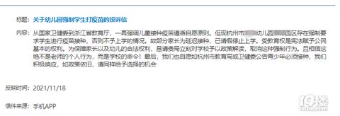 近期,家长群内有家长在说:不打疫苗老师不让入学。 在政务投诉网上也有相关投诉—— 标题:关于幼儿园强制学生打疫苗的投诉信内容:从国家卫健委到浙江省教育厅,一再强调儿童接种疫苗遵循自愿原则。但现杭州市xx幼儿园xx园区存在强制要求学生进行疫苗接种,否则不予上学的情况。故部分家长为延迟接种,已请假停止上学。受教育权是宪法赋予公民基本的权利。为保障家长以及幼儿的合法权利,尽请贵局立刻对学校予以政策解读,