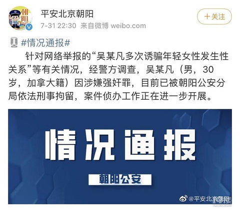 吴亦凡因涉嫌强奸罪目前已被刑事拘留 周六晚上,北京市公安局朝阳分局官方通过微博发布:针对网络举报的“吴某凡多次诱骗年轻女性发生性关系”等有关情况,经警方调查,吴某凡(男,30岁,加拿大籍)因涉嫌强奸罪,目前已被朝阳公安分局依法刑事拘留,案件侦办工作正在进一步开展。 小学课本中的名字是不是该改? 昨晚吴亦凡被刑拘的消息一出,不少家长就想到了人民教育出版社出版的小学英语课本(PEP三年级起点)里的人物