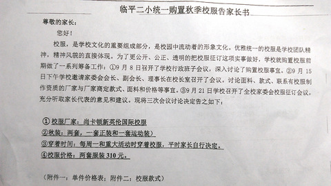 校服为滨江一企业订做,各位帮忙看看合理不?有什么意见说说吧!夏季校服已买过了,且用紫光灯照射后为荧光剂超标,也许是灯的质量不好吧,自我安慰一下。请各位看图,有图有真相!1.家委会是个什么组织?从来没有选举过,也更不可能被选(与人大相似)!2.此小学每周一必须穿校服,否则教导巡查人员会问学生本人为什么不穿校服,不穿校服班级要被扣分!3.潜规则无处不在,你敢不买吗?!哪有小孩不喜欢新衣服的!特别要注意