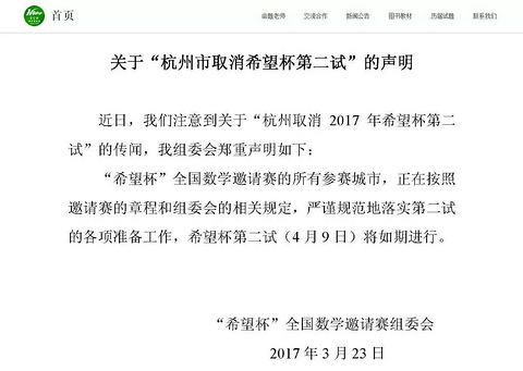 从上周起,“希望杯”已经成为杭城家长热议的话题,没有之一。昨天,杭州赛区的希望杯二试取消的消息刚刚刷爆了朋友圈,这不,剧情马上来了个大反转——“希望杯”全国数学邀请赛组委会马上发了一个声明,希望杯二试将如期进行。这则声明公布在“希望杯”全国数学邀请赛组委会网站的首页,非常醒目,内容是这样子的:声明发布的时间是3月23日,也就是杭州希望杯二试将取消的第二天。怎么会这样子?杭州赛区的二试到底是取消了,
