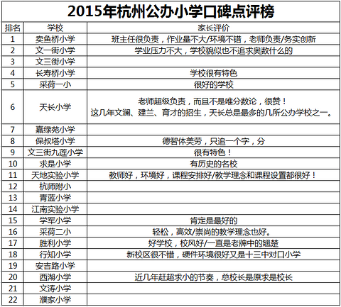 最近,关于幼升小的新闻不断, 版内不少学爸学妈前来咨询杭城各小学一些情况。比如“作业多不多”、“老师耐心吗?”、“学校伙食怎么样?”以及“学校活动多不多”等。既然大家的需求那么大,那我们就先来一期“杭城公办小学”的排行榜。欢迎家里小孩已经上学的家长来评分,让我们来评出我们自己的2015年杭州公办小学排行榜!我们需要您的建议!·【爆满】看看2014年每个小学都几个学生一班2014杭州小学班级人数大比