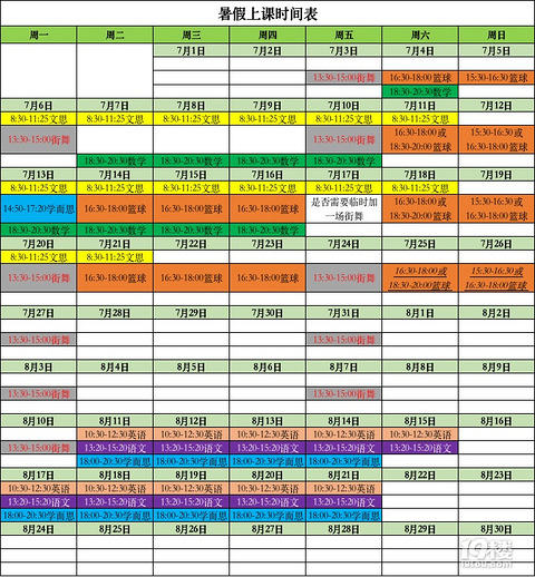 看到19楼上最近在写孩子的暑假班情况。来晒晒我家的,这是当初刚开始做的计划表,但是最后因为孩子掌握情况,没人接送,很多都调整了。花费么,也还好,很多都是第一次体验课,除了街舞和篮球贵一些,少年宫的文思1000多,新东方升三3门有优惠,好像是1499,学而思计划停掉了,这样算算5000左右吧 虽然看上去安排得满满的,但是其实细看,很多课程比如篮球、街舞都是娃自己喜欢的,一定要求安排上的,另外7月21