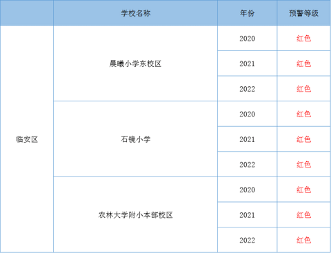 根据《浙江省教育厅关于建立义务教育阶段公办学校户籍生入学信息发布和预警机制的指导意见》要求,杭州市各地教育部门采集了2019年各公办小学学区内户籍儿童入学情况数据和各小学今后三年学区内户籍儿童信息(截至入学当年8月31日满6周岁的儿童),现将各区、县(市)户籍儿童小学一年级入学2019年招生信息,和2020-2022年预警信息公布如下: 预警等级 黄色预警,表示学区内适龄户籍儿童人数介于学区小学常