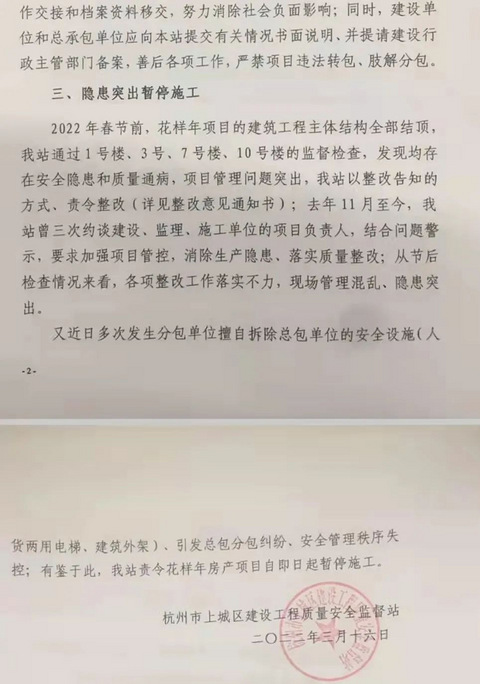 近日,收到花样年对越天业主的求助,称该楼盘已经停工多日,担心会“烂尾”。 针对业主的这一忧虑,记者采访了上城区住建部门,住建部门就如何“保交付”给出了回应。 花样年对越天暂停施工问题出在总包单位身上 去年10月8日晚间,花样年创始人、大股东曾宝宝向花样年全体员工发布《宝爷家书》,首次对花样年所遇问题做了一次全面复盘,称标普突然大幅下调公司评级,致使公司境内外融资交叉严重受限,流动性出现阶段性紧张,