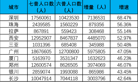 七普数据出来了,很多文章只对比了部分城市,都不全面。这一次,我把全国300多个城市的七普数据全部扒了出来,发掘隐藏在数据里的人口真相。 揉眼一看,结果大出所料! 人口增长最快的城市 很多人以为人口增长速度最快的是深圳,其次就是杭州、广州了。其实,广州只能排在第六位。杭州更是跌出Top10。 占据人口增速第二名的,是另一个特区城市——珠海。 近十年全国常住人口增速最快的10个城市这些数据,剔除了行政