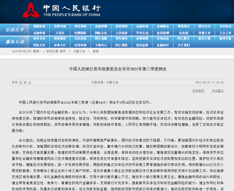 今天,一条消息直接点燃A股市场房地产板块,A股市场昔日四大地产龙头股“招保万金”(招商蛇口,保利发展,万科A,金地集团)悉数大涨,今日涨幅均超过5%,整个地产板块涨幅3%——利好来源于央妈关于房地产行业的表态。 中国人民银行官网截图 近日,中国人民银行货币政策委员会2021年第三季度例会在京召开,和二季度相比:针对楼市提出了“两个维护”的新说法。所谓“两个维护”,就是:维护房地产市场的健康发展,维