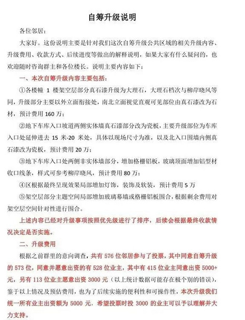 这两天,滨江核心区某地铁盘传出一份《自筹升级说明》,尚未交付,有一群业主就打算自筹升级,4.7万的盘还要改造升级?朋友圈吃瓜群众惊呆了。 自筹,筹什么? 该说明包括升级内容明细,费用自筹两块。简要说一下内容。 小区目前尚未交付,业主发起自筹,拟对公共区域进行改造提升:包括架空层部分,地下车库,以及小区灯饰,装饰及软装的改造,材料样式(档次)对标柳岸晓风。 费用这块,原文如下:“根据之前群里的意向调