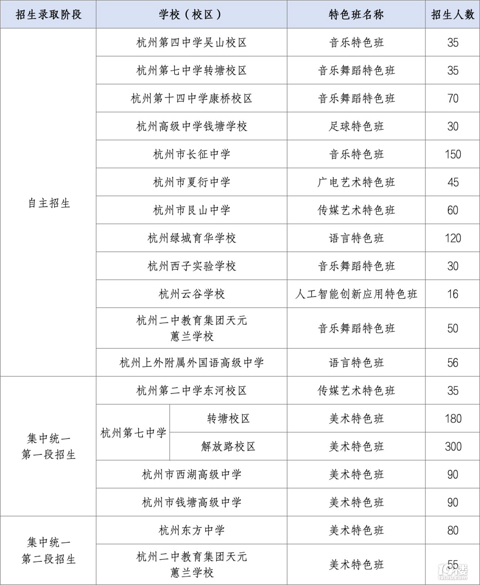 根据《杭州市教育局关于2025年杭州市区各类高中招生工作的通知》(杭教基〔2025〕4号,以下简称《招生工作通知》)有关要求,为认真做好2025年市区(上城区、拱墅区、西湖区、滨江区、钱塘区和西湖风景名胜区,下同)综合高中试点班招生工作,现将有关事项通知如下: 招生对象和报名条件 同《招生工作通知》(点击查看)中规定的招生对象条件和招生录取前置条件。 招生学校和招生计划 2025年,杭州市美术职业