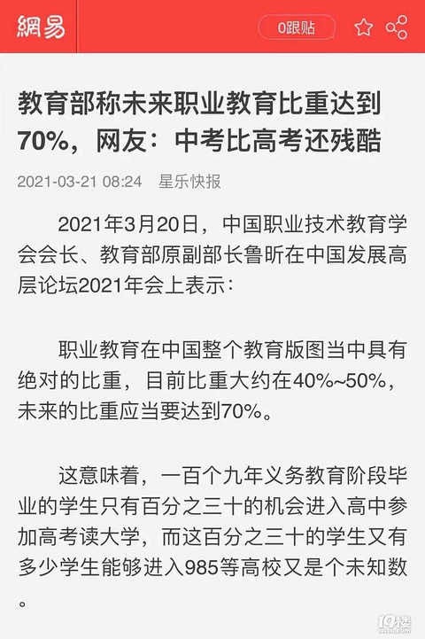 这几天好多自媒体在说职业教育占比要提高到70%的事情,甚至还有人说以后只有30%的学生能去上普通高中了。这?发生了啥?之前不是才科普过普职比稳定在1:1么?怎么突然就要提高这么多?仔细一查,估计不少家长根本没有仔细看内容,或者说有些自媒体根本就是在断章取义,制造焦虑。 来看看到底是怎么一回事。 “3月20日,中国职业技术教育学会会长、教育部原副部长鲁昕在中国发展高层论坛2021年会上表示,职业教育