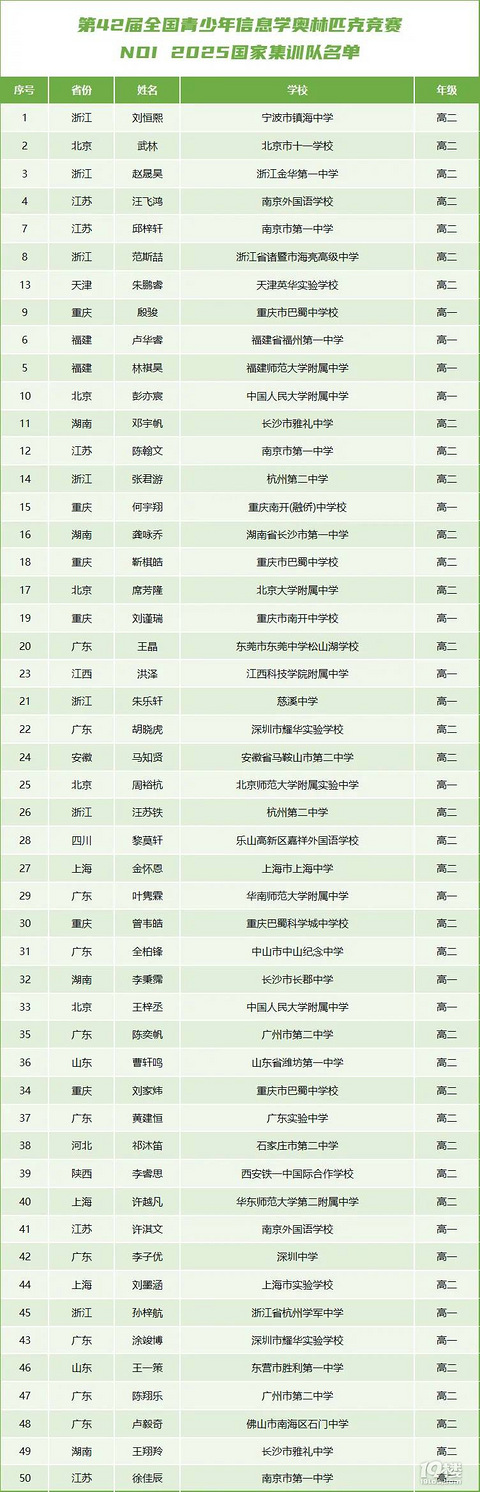 NOI2025国集名单新鲜出炉,浙江7位保送清北