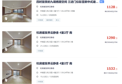 新房交付=二手挂价跳涨,已是杭州业主的基操。 近期最夸张的,就是迎来两大交付新房的申花。截至昨日14时,贝壳二手房网显示,养云静舍挂牌均价97593元/㎡,宜和园挂牌均价89456元/㎡。 挂牌单价最低78334元/㎡(宜和园191.49㎡),最高110026元/㎡(养云静舍139.24㎡)。 “相比周边小区,差不多跳空高开了2万/㎡。”附近的中介说。 即便在整个杭州二手房价体系中,这也是绝对“金