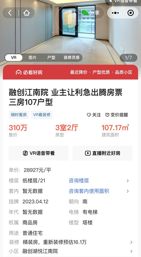 随着二手房价的下滑,部分刚需次新房的房东们相继发现,曾经好不容易摇到的“倒挂盘”,现在挂牌价竟和当年买入价相差无几了。 比如萧山科技城江南壹号院目前挂价最低的一套107㎡,仅310万,折合单价28926元/㎡,而当年该楼盘新房均价28300元/㎡。 图源:贝壳找房 日前,记者走访了萧山科技城,发现这里的次新房,急售房源着实不少。中介称,有一套急售房源已经以310万元总价成交,户型面积103㎡,折合