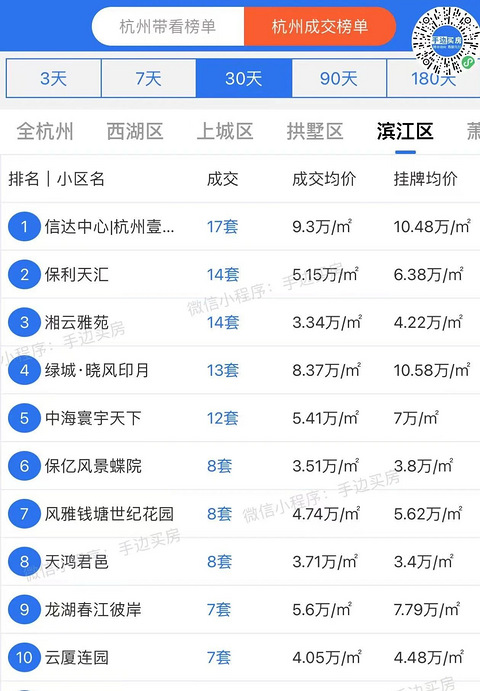 01 杭州二手房回暖,江南岸的滨奥助力不小。 尤其是一些高端改善盘,充当了领头羊角色。比如奥体顶流豪宅壹号院,和江南实验明星次新房晓风印月,活跃度都非常高。 但打开成交量榜单,你会发现,还有一个特殊的小区表现不落下风。 它就是大热红盘万科·江斓映象府南侧一路之隔的湘云雅苑,也是滨江区最大的安置房小区之一。 截至昨日,手边买房数据显示,近30天湘云雅苑网签量高达14套。 这是什么概念?在整个滨江区,