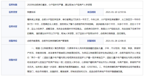1月28日,合肥发生了一件很有意思的事情,在全网传播。 数据来源:合肥市政府 在这个留言板上,有位热心市民投诉,“强烈建议60平方以下户型,取消入学资格,没了这些小户型带头炒作,合肥房价降降温,回归理性。” 而合肥教育局等部门的回复,直接指出上学是“以家庭户籍和房产地址作为入学依据,与房产面积、家庭财产状况无关”。 简单点说,就是不相干,而且不可能。 这样一个问答,在网上引发了热议。 这位投诉的热