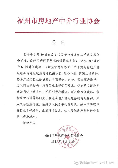 福州打响调整中介费“第一枪”后却又“熄火”了。 6月1日下午,福州市房地产中介行业协会发布《关于合理调整二手房产交易佣金标准促进房产消费复苏的指导意见书》(以下简称意见书),根据意见书,在福州房地产市场买卖房屋,支付佣金的交易办法,由以前的由买方支付佣金的方式,调整为由买、卖双方等比例分担佣金,佣金的收费标准定为双方各自1.5%。 值得注意的是,对于中介公司来说,按照福州当地此前的中介费收费标准为