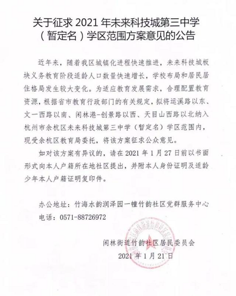学区划分引发热议 1月13日,未来科技城四小、三中的学区划分引起了轩然大波,起因是未来科技城三兄弟的学区面临“舍近求远”的现实问题:家门口1公里左右的“四小”没法入学,却要去3公里外的仓前小学就读。 根据高德地图显示,三兄弟到仓前小学不仅步行需要40多分钟时间,还要穿过文一西路这样的主干道,存在较大的安全隐患,这引起了三兄弟业主的集体“维权”。 紧接着在1月21日,地方教育局突然公布了一则扩大学