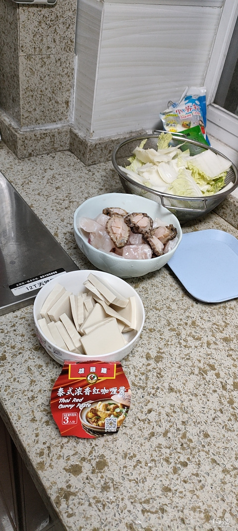 食材:大白菜叶5片、大土豆一颗,千叶豆腐1/2盒、沙巴鱼块280克、鱿鱼圈60克、小鲍鱼5个; 雄鸡标泰式红咖喱酱一盒50g,椰浆一盒200g,清水120ml(够3人份吃)1、土豆切块水里煮15分钟后捞出备用。2、热油下锅炒大白菜,白菜变软出水后加入其他食材翻炒片刻3、锅中加入咖喱酱、椰浆、清水,轻轻翻炒均匀,加盖小火焖煮8分钟4、关火装盘,没有加其他调味料,我觉得味道刚好。咖喱汁配米饭好