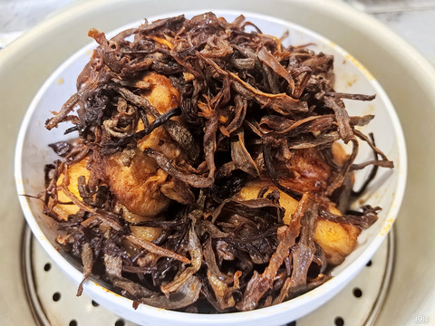 老陈哥给我拿了点他老家绍兴的笋丝梅干菜,香气扑鼻!为了烧好它,我专门一下班去就去买了土猪肉,这一次就用绍兴古法蒸,先把猪肉切大块,反复煸出油水,按照“法定程序”加入桂皮、八角、干辣椒爆香,然后加入料酒、生抽、老抽,区别于红烧肉,有咸味的调料一定要少量,最后加入少许老冰糖微微有点糖色。笋丝梅干菜的处理稍微水冲下浮灰沥干即可,过水太久鲜味会消失然后加入拌炒,全部盛出来后用高压锅蒸二十分钟撒葱花出锅即可
