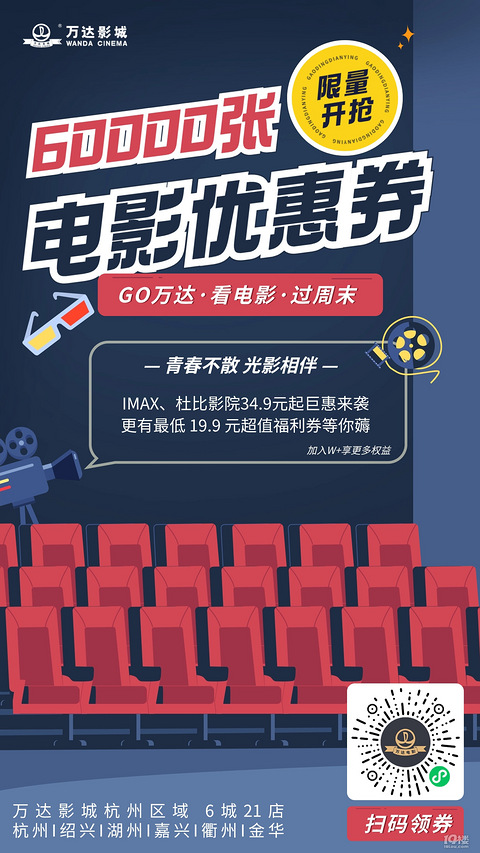 万达影城60000张优惠券限量开抢~ IMAX、杜比影院34.9元起巨惠看! 更有最低19.9元超值福利券等你来薅! 万达影城杭州区域6城21店:杭州绍兴湖州嘉兴衢州金华