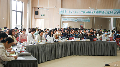 杭州19楼教育通讯员 李梦琪 为贯彻落实《幼儿园教育指导纲要(试行)》、《3-6岁儿童学习与发展指南》、《幼儿园保育教育质量评估指南》以及浙江省相关托育管理文件的精神,扎实提升幼儿园“托幼一体化”保教质量,发现、培植、分享相关研究成果,2023年5月10日,杭州市幼儿园“托幼一体化”背景下的课程环境创设研修钱塘分会场活动在幸福河幼儿园举行。 本次活动由钱塘区教师教育学院主办,幸福河幼儿园承办。钱塘