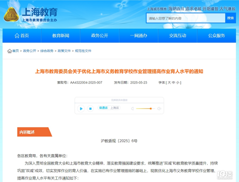 近日,上海市教育委员会发布《上海市教育委员会关于优化上海市义务教育学校作业管理提高作业育人水平的通知》。 《通知》提到,不得给家长布置或变相布置作业,不得要求家长检查、批改作业,不得要求或变相要求家长给学生布置作业;小学一、二年级不布置书面回家作业,可在校内适当安排巩固练习,小学其他年级每天书面作业平均完成时间不超过60分钟,初中每天书面作业平均完成时间不超过90分钟;推动学校逐步建立“小学每周一