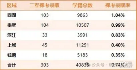 2025年中考杭州主城区各区二军裸考录取率,上城不到滨江一半