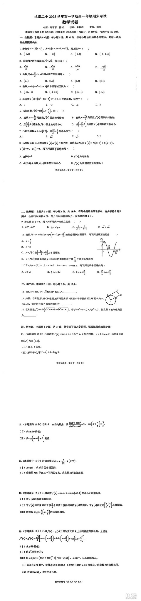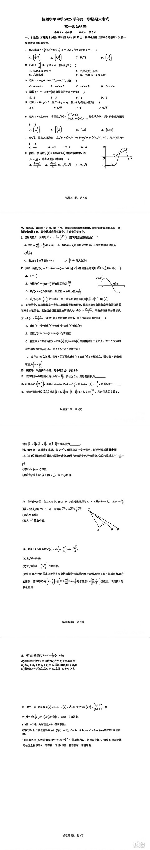 杭州二中2025-2026学年第一学期高一期末考试数学试卷