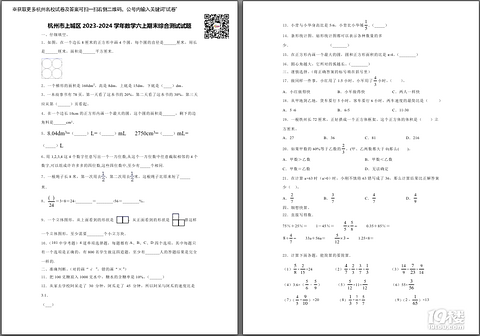 19楼教育版块为您提供2025年杭州市六年级上学期数学期末试题,获取试卷完整电子版pdf免费下载及参考答案分析请下拉至文末。 学校:杭州市学年:2025 年级:六年级学科:数学性质:期末文件大小:365kb PDF密码请添加下图助手号领取