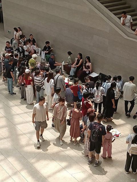 在浙江美术馆中央大厅见到由退休老人组成的银发写生团在进行现场速写创作,为观众绘制肖像。观众和美术产生了互动,使美术館更富有生气和活力,也体现了杭州是一个文化城市。除传统铅笔外,参与者还使用水墨、水彩、甚至iPad等媒介创作,展现跨年龄、跨媒介的艺术表达方式。 ?