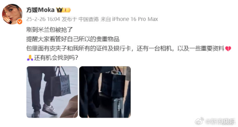 今天,郭富城妻子方媛发文称,”刚到米兰包被抢了,提醒大家看管好自己所以的贵重物品,包里面有皮夹子和我所有的证件及银行卡,还有一台相机,以及一些重要资料,还有机会找到吗? 中国驻米兰总领馆曾发文提醒今年2月6日,中国驻米兰总领馆曾发文提醒来意中国游客增强防盗抢意识:近日,罗马、佛罗伦萨等地相继发生中国旅行团财物、证件集体失窃案件,涉及中国公民数十人,造成不同程度财产损失。中国驻意大利使领馆坚持外交为