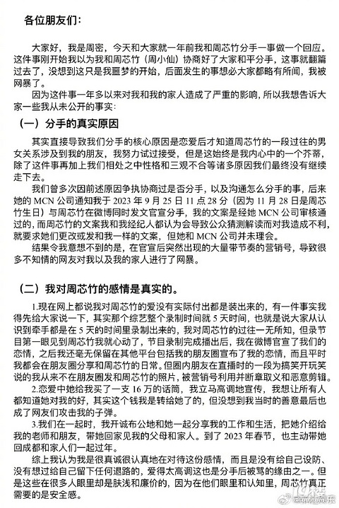 29日,周密发长文回应和周芯竹分手,称两人协商和平分手是“噩梦的开始”,自己和家人被严重影响,选择公开一些事情. 1.公开两人分手的核心原因是,周密得知周芯竹一段过往的男女关系涉及到他朋友;表示自己的分手官宣文案经周芯竹MCN公司审核,但要求调整对方或引争议的文案时遭到无视。 2.表示自己对周芯竹的感情是真实的,在节目中对她一见钟情,并澄清自己平时会在朋友圈分享两人日常、周芯竹给她买的16万的话筒