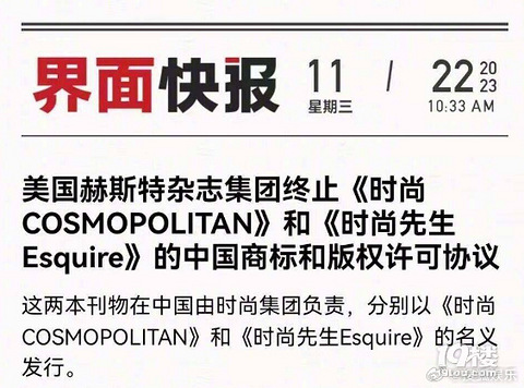 11月22日, 美国赫斯特杂志集团近日发布声明,正式终止《COSMOPOLITAN》和《Esquire》在中国的商标和版权许可协议,即刻生效。据悉,这两本刊物在中国由时尚集团负责,分别以《时尚COSMOPOLITAN》和《时尚先生Esquire》的名义发行。赫斯特杂志集团称,目前正在接洽潜在的新合作伙伴,以期在中国市场重新推出上述杂志品牌。 来源:搜狐娱乐