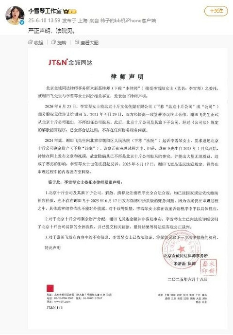 国家企业信用信息公示系统网站显示,1月12日,上海七吟创意策划工作室登记状态由存续变更为注销,注销原因为决议解散。 天眼查App显示,上海七吟创意策划工作室成立于2021年1月,投资人为李雪琴(本名李雪阳),出资额10万人民币,经营范围包括演出经纪、企业形象策划、项目策划与公关服务等。值得一提的是,目前,李雪琴名下公司均已注销。 此前报道 2025年6月17日,原李雪琴合伙人谢田飞在社交媒体发