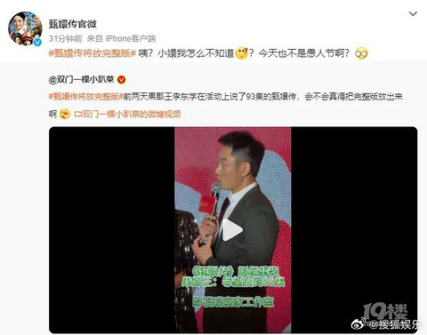 近日,网传甄嬛传将放完整版,随后甄嬛传官博发文否认此事:“咦?小嬛我怎么不知道?今天也不是愚人节啊?” 来源:搜狐娱乐