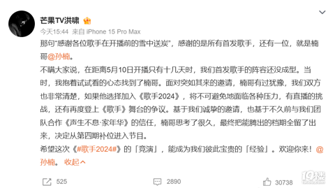5月29日,歌手导演洪啸发文:那句“感谢各位歌手在开播前的雪中送炭”,感谢的是所有首发歌手,还有一位,就是楠哥。不瞒大家说,在距离5月10日开播只有十几天时,我们首发歌手的阵容还没成型。当时,我抱着试试看的心态找到了楠哥。面对突如其来的邀请,楠哥有过犹豫,我们双方也非常清楚,如果他选择加入《歌手2024》,将不可避免地面临各种压力,有直播的挑战,还有再度登上《歌手》舞台的争议。基于我们诚挚的邀请,