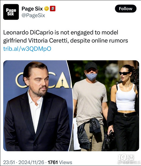 26日,外媒爆料“小李子”莱昂纳多·迪卡普里奥将与26岁超模女友Vittoria Ceretti订婚,引热议。对此,《纽约邮报》PageSix最新报道称有消息源否认小李子将订婚,表示“不过是网络谣言,(迪卡普里奥)每个月都要被传订婚。” 来源:新浪娱乐