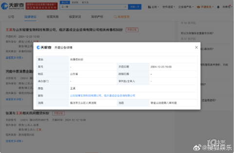 天眼查法律诉讼信息显示,近日,王一博与两公司相关肖像权纠纷案件新增开庭公告,原告为王一博,该案将于12月23日在临沂市兰山区人民法院开庭审理。